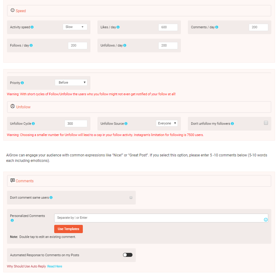 Manual Growth Activities – Follows, Unfollows, Liking:Manually adjusting the settings will map the target you want and AiGrow will take you to your target.