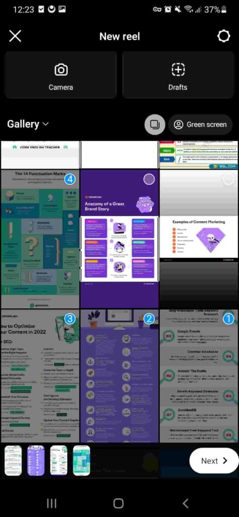 - Select a series of photos or videos that you want to include in your Reel. Make sure they are of good quality and relevant to your chosen theme or message.