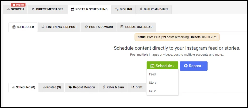 One way to use AiGrow is to use its scheduling features. Just upload your content to your AiGrow’s dashboard. Then, you can either edit them yourself or assign your account manager to design them. The good news is that you can schedule all types of content: feed post, story, and IGTV.