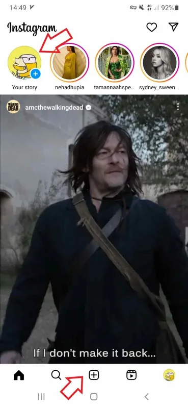 - Just go to your feed and tap the plus icon (+) at the top left or in the middle bottom to add a story or post.