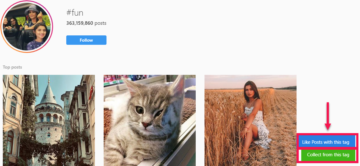- If you activate “Collect Posts from Tags to Like,” visit a hashtag page on Insta and then click the button βLike Posts with this tag.β