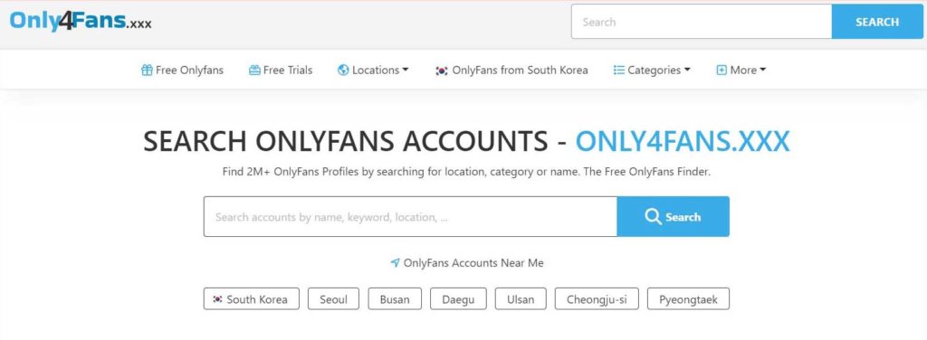 Another free and user-friendly OnlyFans search engine is Only4Fans.xxx, which has a database of 2M OnlyFans profiles. Enter the website and search for creators by their name, category, location, or the accounts that are near you based on your IP address. Β