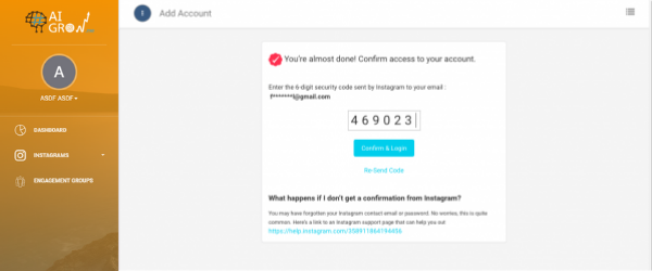 When trying to overcome a security checkpoint on AiGrow, you will be asked to provide the verification code sent to you by Instagram through email. The screen asking you will look like this: